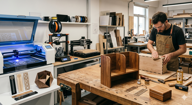 Our workshop lives in two worlds. On one side, we have laser cutters, 3D printers, and CNC routers humming with surgical precision. This allows us to create complex acrylic calendars, intricate bookmarks, and perfectly fitted desk bookshelves.